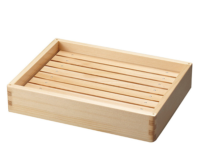 ※材質 : 東濃ひのき ※バットの外側四ツ角はRがついております。 ※お造りなど、盛込にもお使いいただけます。 内寸約23×17×H4.2cm/目皿高さ:約2.4cm