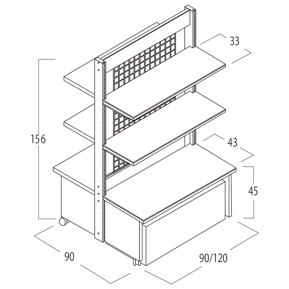 棚板:D33cm×4枚 キャスター:φ5cm(内2ヶはストッパー付き)